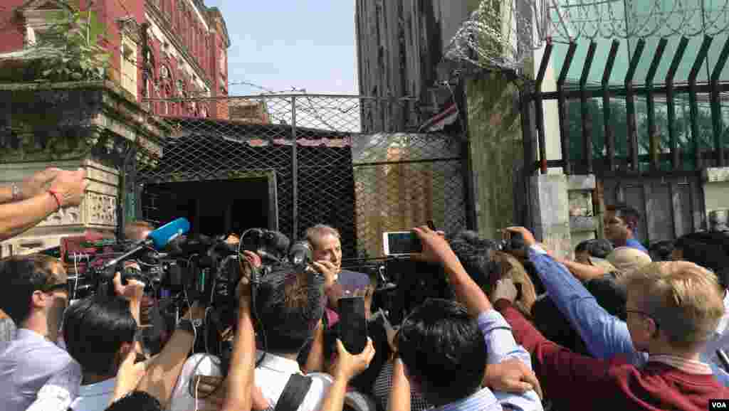 ကိုဝလုံးနဲ့ ကိုကျော်စိုးဦးတို့ရဲ့ အကျိုးဆောင်ရှေ့နေ ဦးသန်းဇော်အောင် သတင်းထောက်များနှင့် စကားပြောနေစဉ်။ (ဇန်နဝါရီ ၁၁၊ ၂၀၁၉ ဓာတ်ပုံ - VOA )