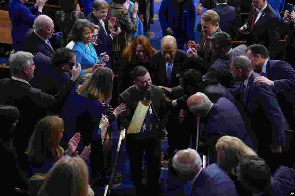 နန်စီပလိုစီကလည်း ဗုဒ္ဓဟူးနေ့က လွှတ်တော်အဆောက်အဦးမှာလွှင့်ထူခဲ့တဲ့ အမေရိကန်အလံကို အမှတ်တရအဖြစ်နဲ့ ယူကရိန်းသမ္မတကို ပြန်လည်ပေးအပ်ခဲ့ပါတယ်။ သူ့ရဲ့ မိန့်ခွန်း စလယ်ဆုံး တလျှောက်လုံးမှာ ယူကရိန်းနိုင်ငံအတွက် အမေရိကန်ပြည်သူတွေက ကူညီပေးတဲ့အပေါ် ကျေးဇူးတင်ကြောင်း သမ္မတဇလန်းစကီးက အကြိမ်ကြိမ်ပြောကြားခဲ့သလို သူ့မိန့်ခွန်းတလျှောက် လွှတ်တော်အမတ်တွေကလည်း အကြိမ်ကြိမ် မတ်တပ်ရပ်၊ လက်ခုပ်တီးပြီး ဂုဏ်ပြုခဲ့ကြပါတယ်။