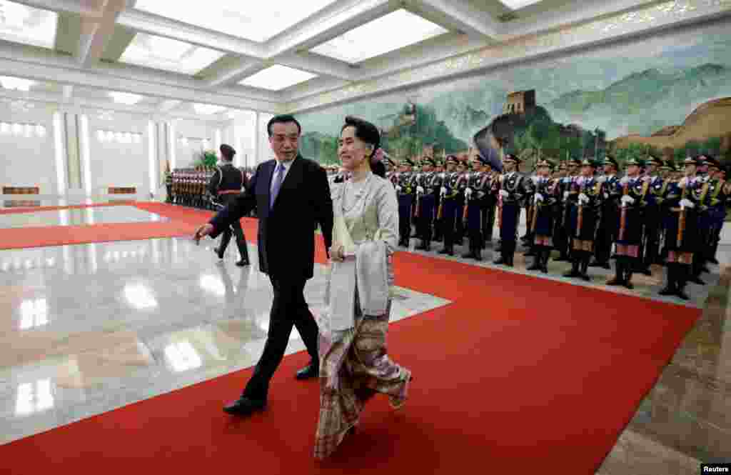 နိုင်ငံတော်အတိုင်ပင်ခံပုဂ္ဂိုလ် ဒေါ်အောင်ဆန်းစုကြည် ကို တရုတ်ဝန်ကြီးချုပ် က Great Hall of the People , North Hall မှာ ဂုဏ်ပြုတပ်ဖွဲ့နဲ့ ကြိုဆိုခဲ့ပါတယ်။