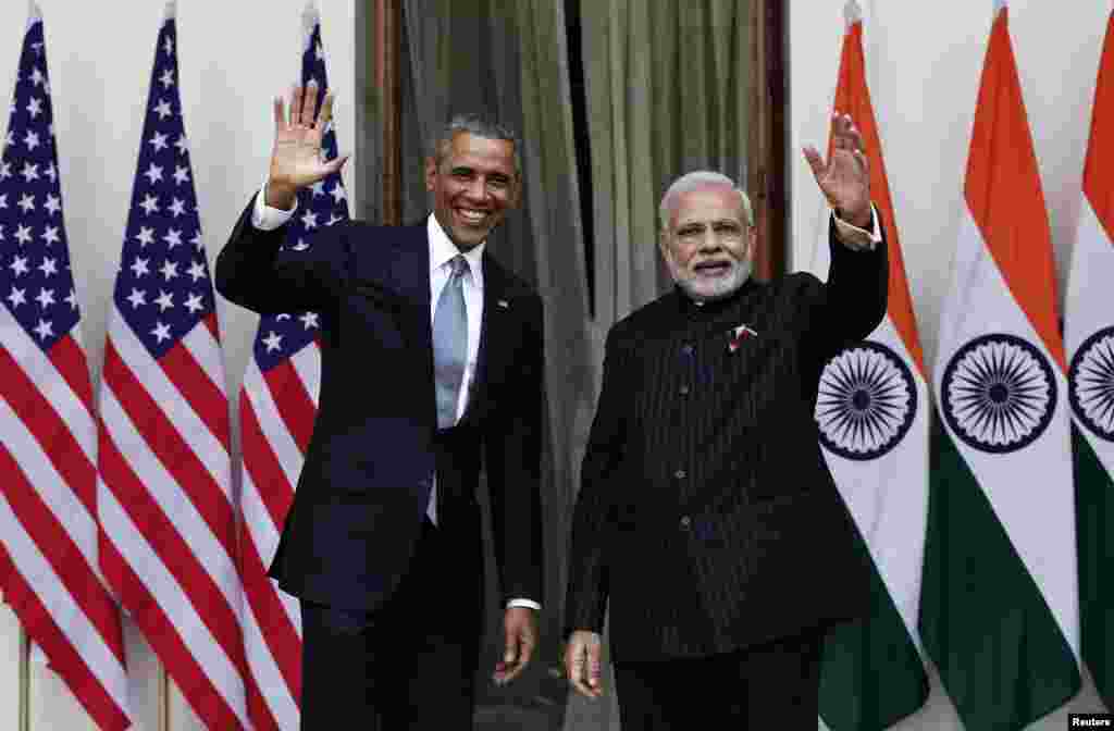 U.S. President Barack Obama and India's Prime Minister Narendra Modi, right, wave during a photo opportunity ahead of their meeting at Hyderabad House, New Delhi, Jan. 25, 2015.