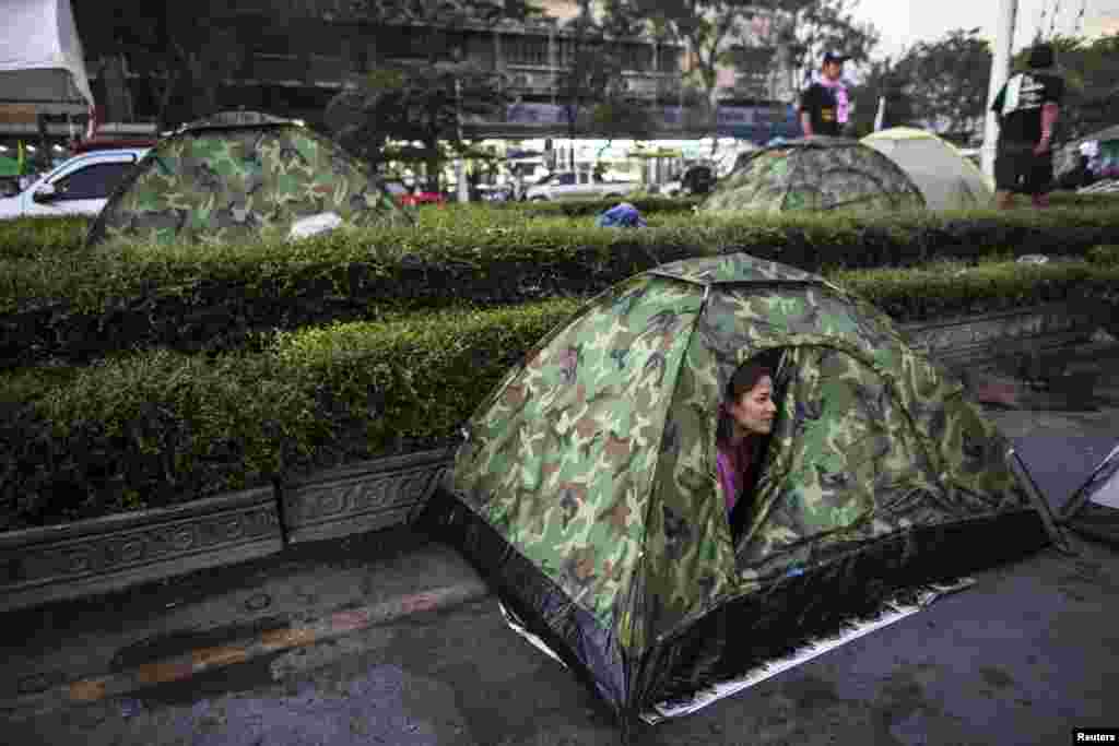 A woman looks out of her tent after waking up in the anti-government protester encampment near the Democracy Monument, Bangkok, Thailand, Jan. 12, 2014.